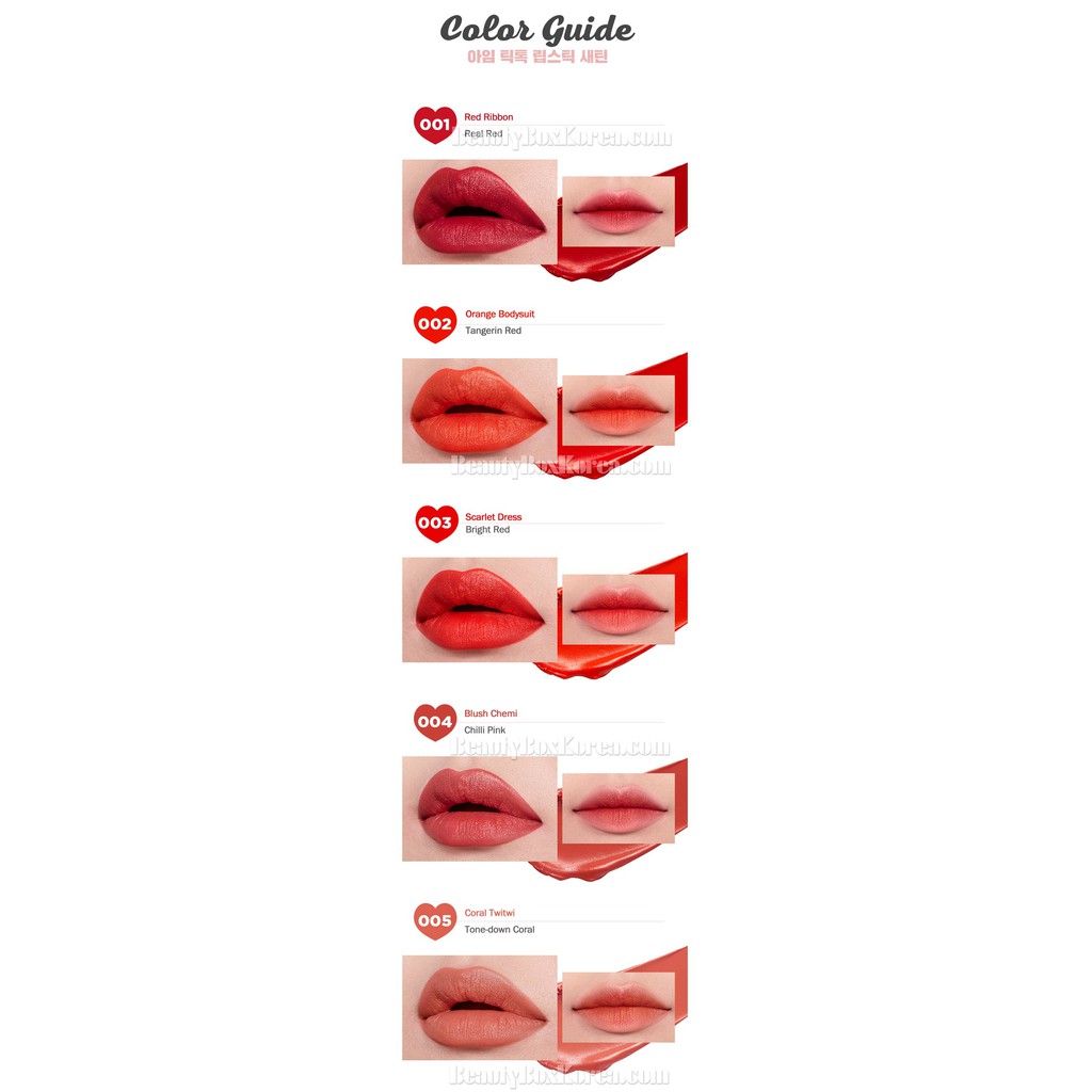 Today ill be sharing about the im tic toc lipstick satin lippies from im meme. Please press the heart variation 001 red ribbon 002 orange bodysuit 003 scarlet dress 004 blush cami 005 coral tete 006 marsala robe 007 pink bomber 008 brick slip 009 nude romper 010 mahogany satin. 71 im meme im tic toc lipstick satin swatch review beauty in your way.